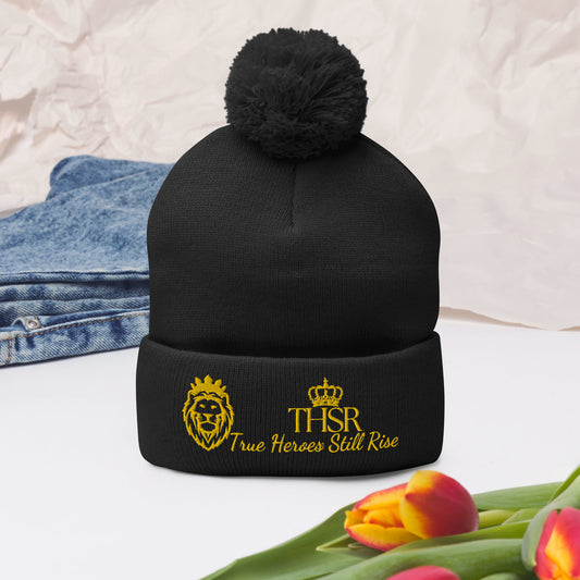 THSR Black Pom-Pom Beanie with Gold Embroidered THSR KING Lion & Crowned THSR True Heroes Still Rise Logo – Warm, Stylish Winter Hat