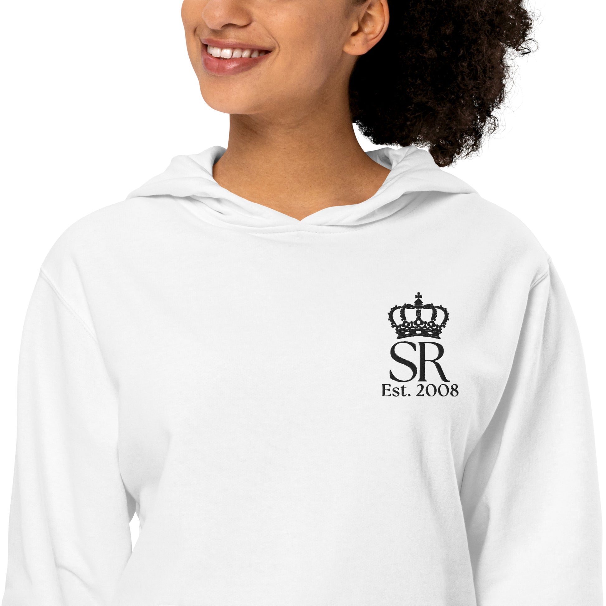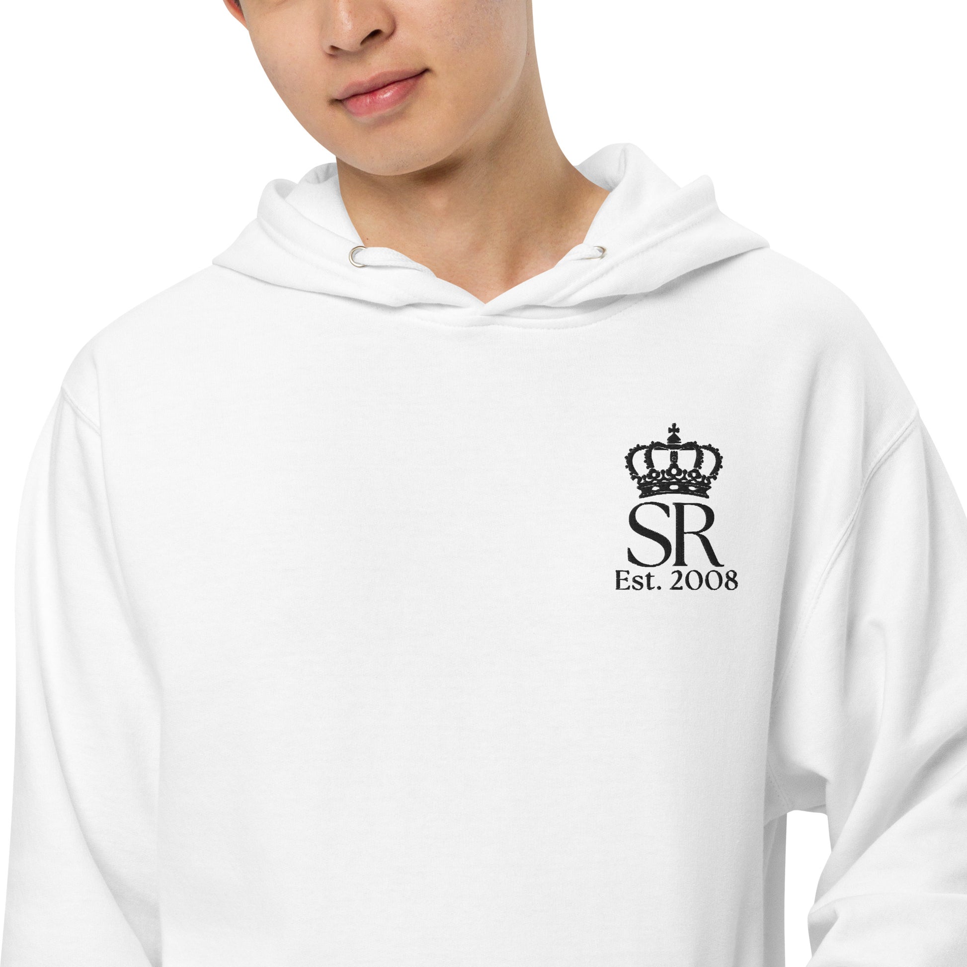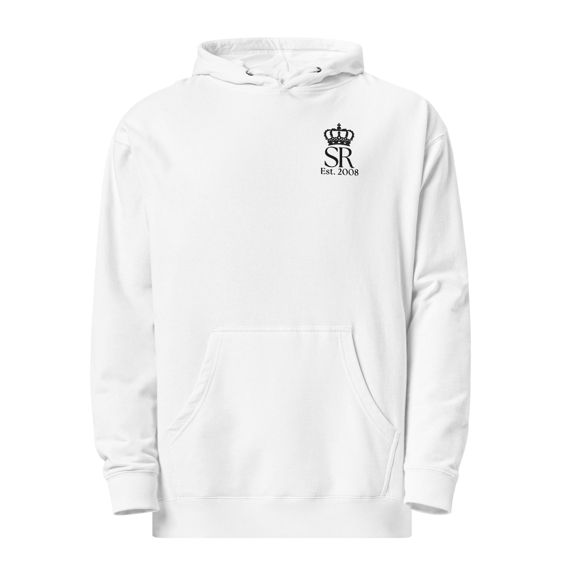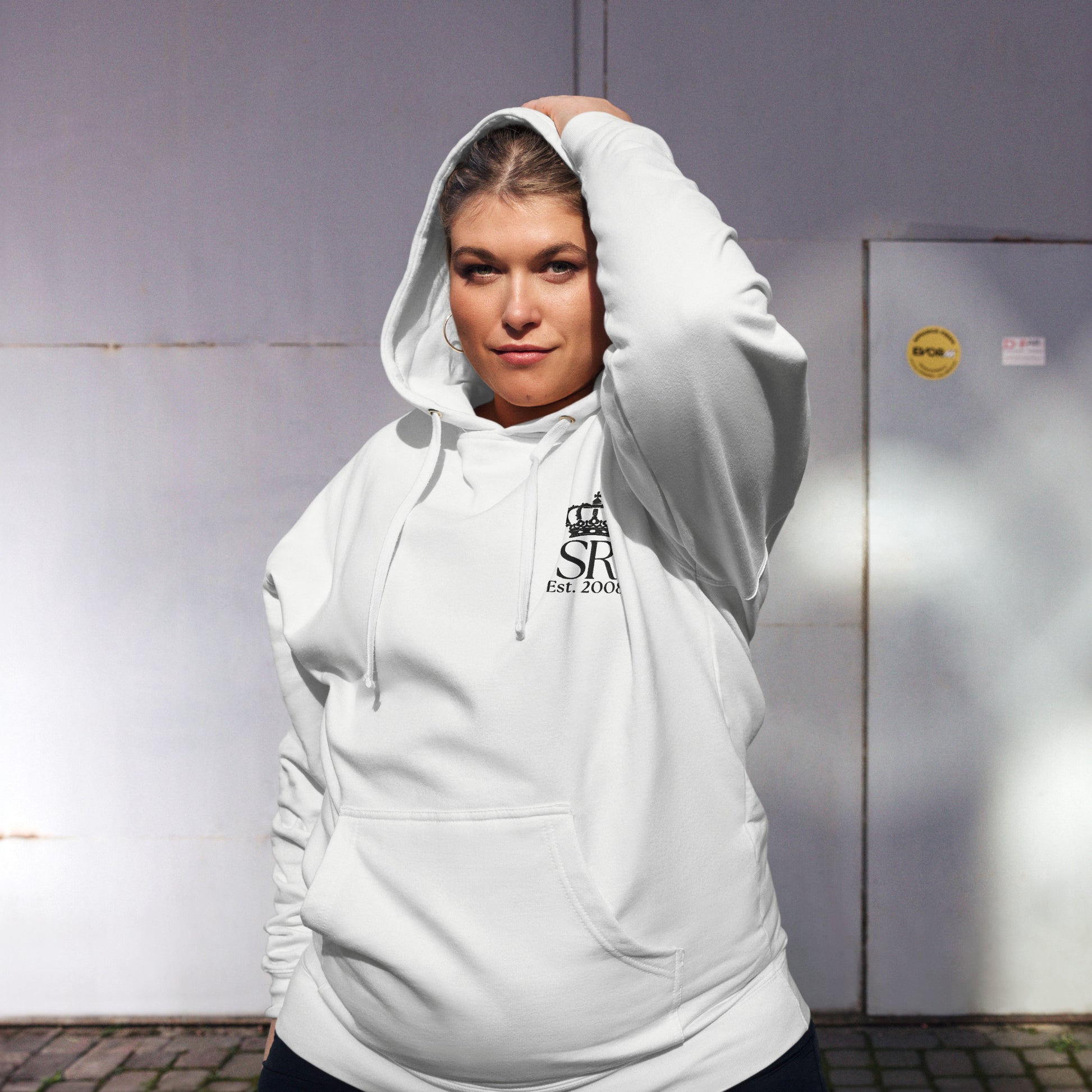 -White Adult Pullover Hoodie Featuring a Striking Black "SR Est. 2008" Logo: Symbol of Regal Strength & Perserverance